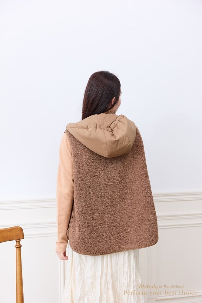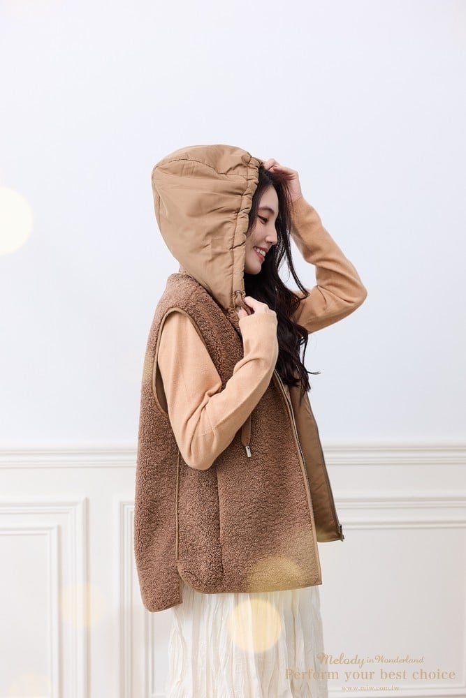 2511-088 異材質拼接毛毛連帽拉鍊背心(3色)