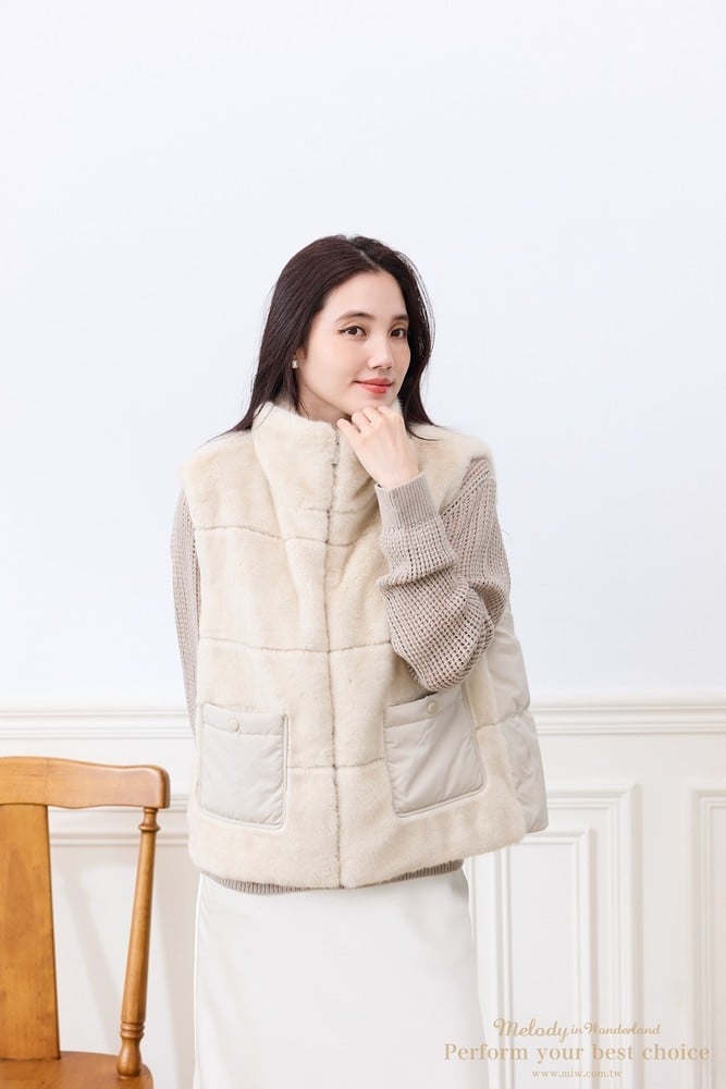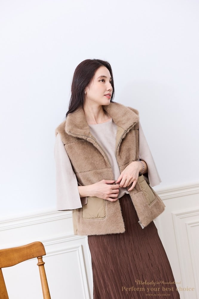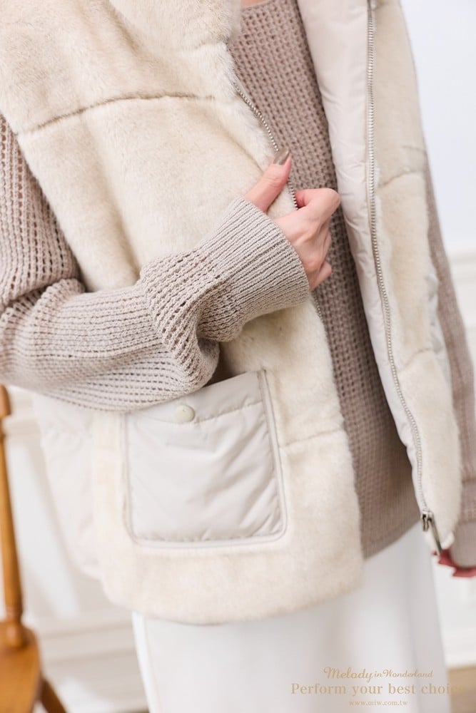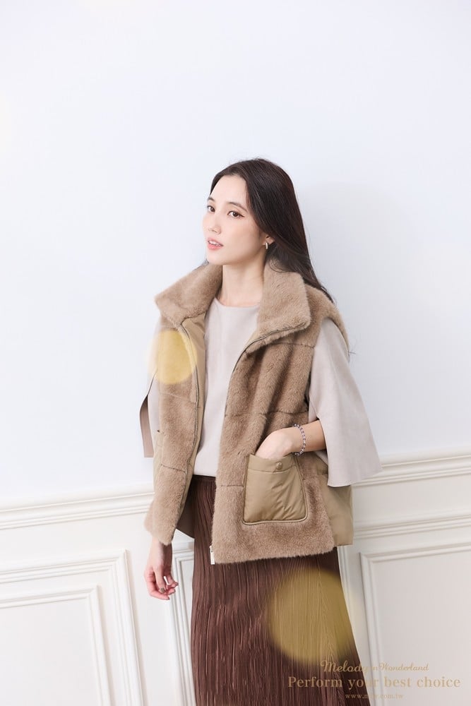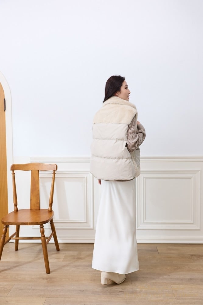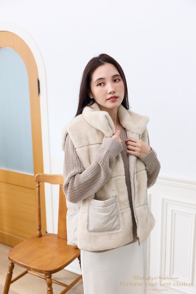 2511-089 貴氣毛海拼接羽絨拉鍊背心(3色)