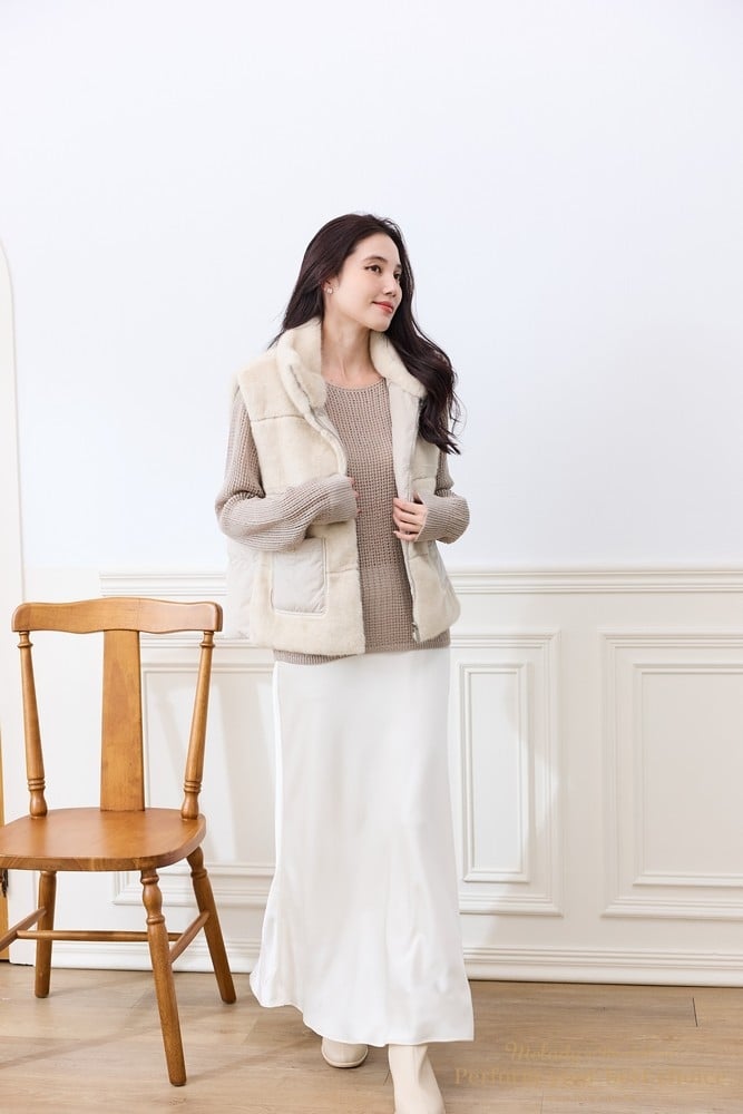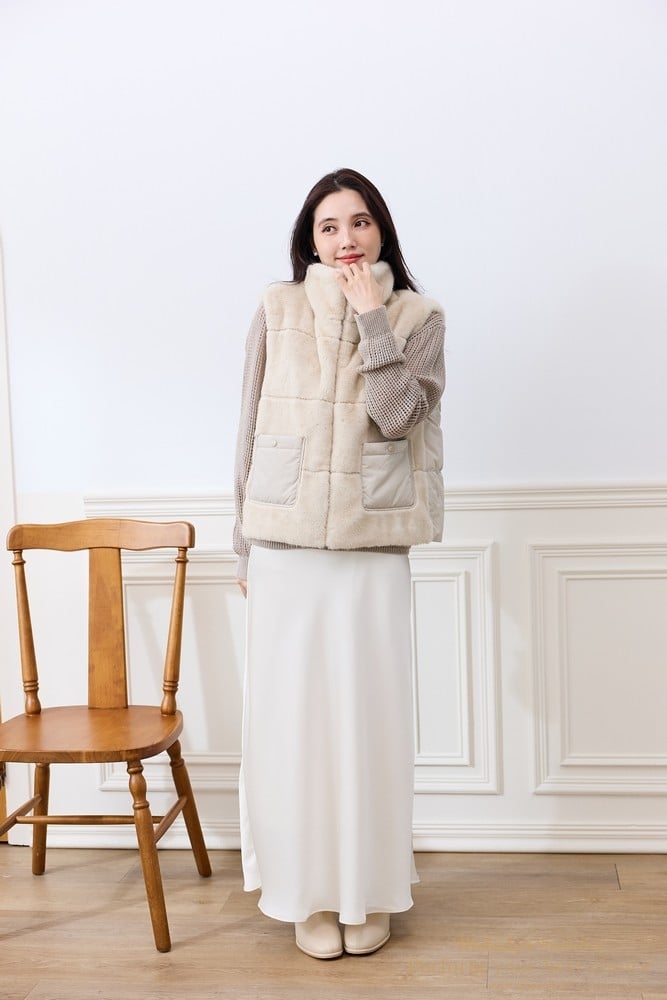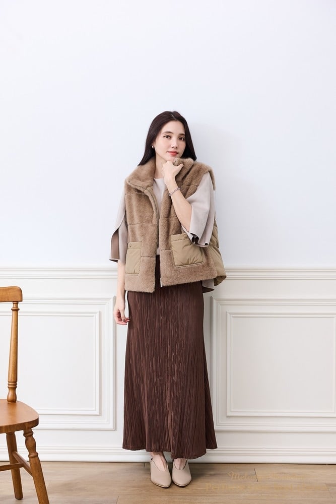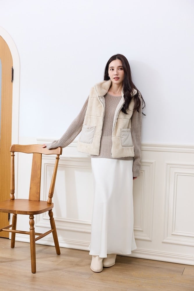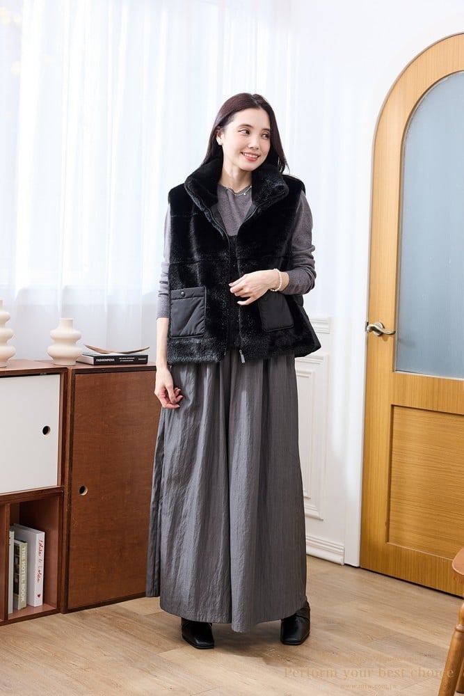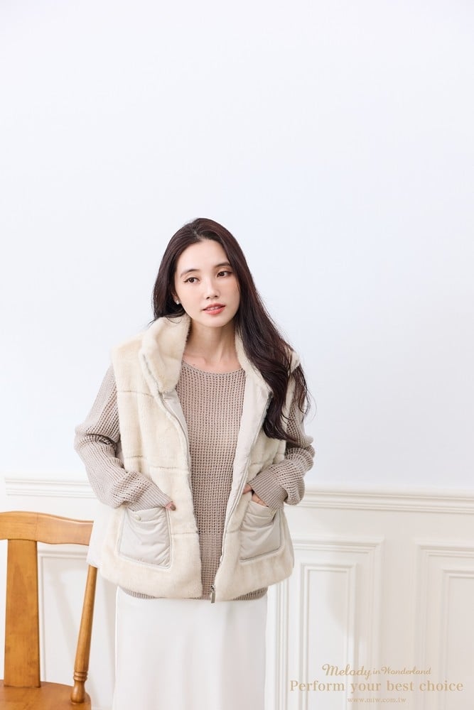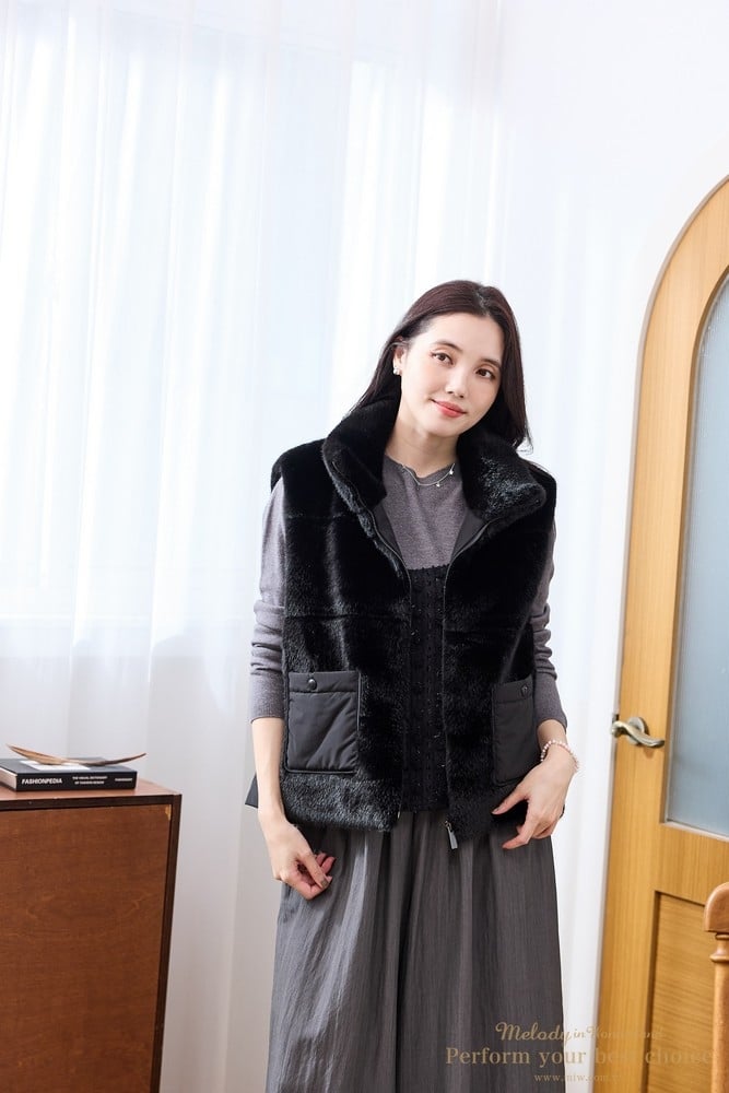 2511-089 貴氣毛海拼接羽絨拉鍊背心(3色)
