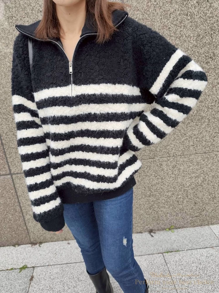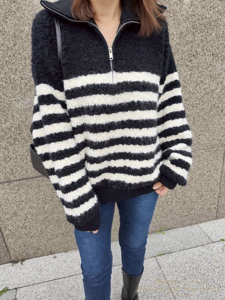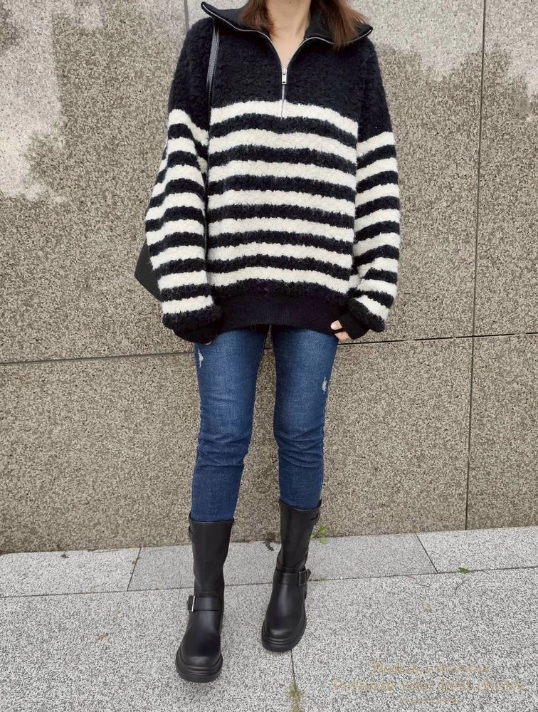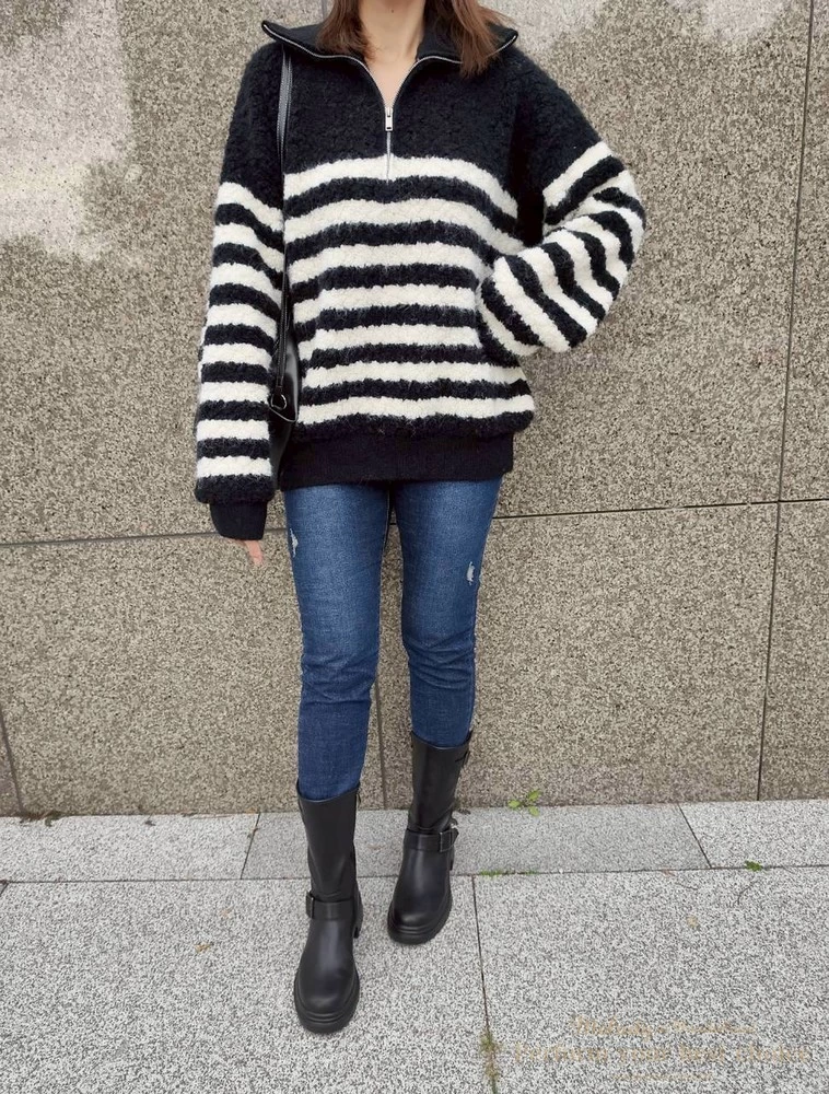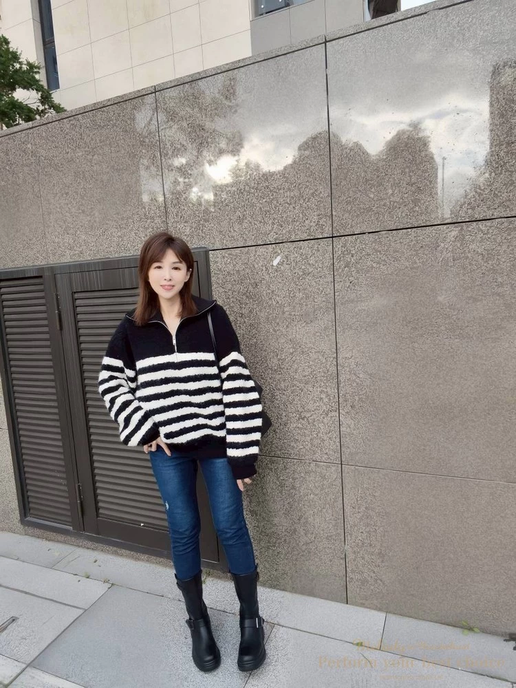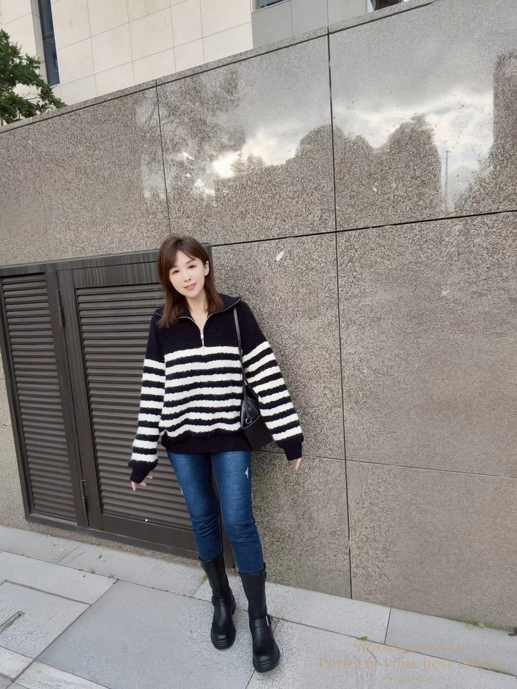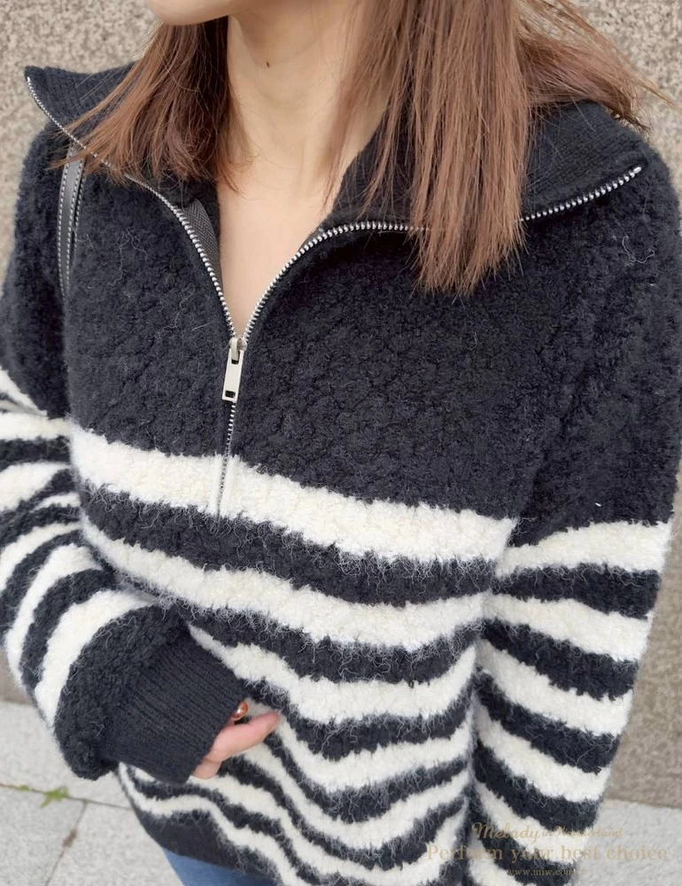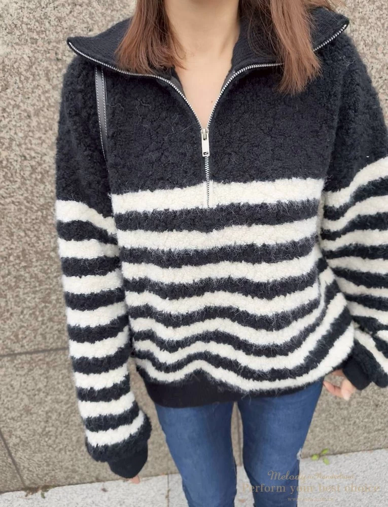 率性拉鍊造型毛感條紋上衣(2色)