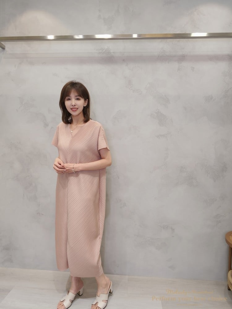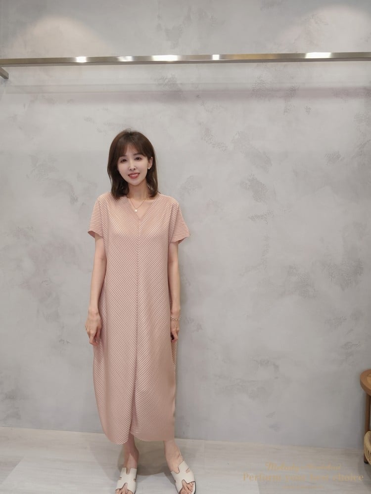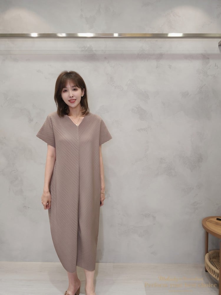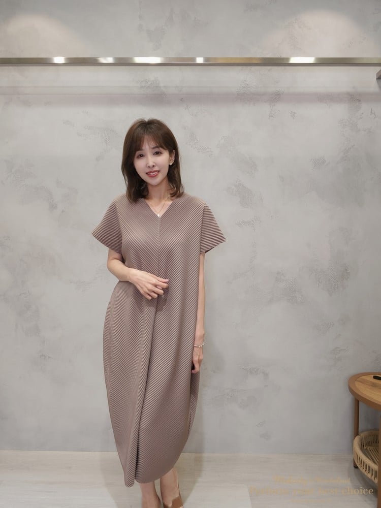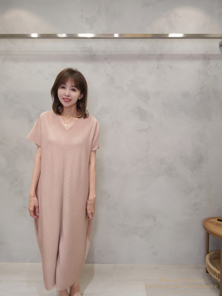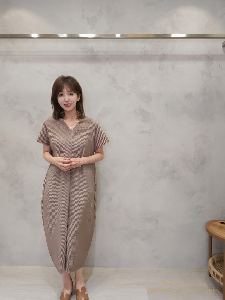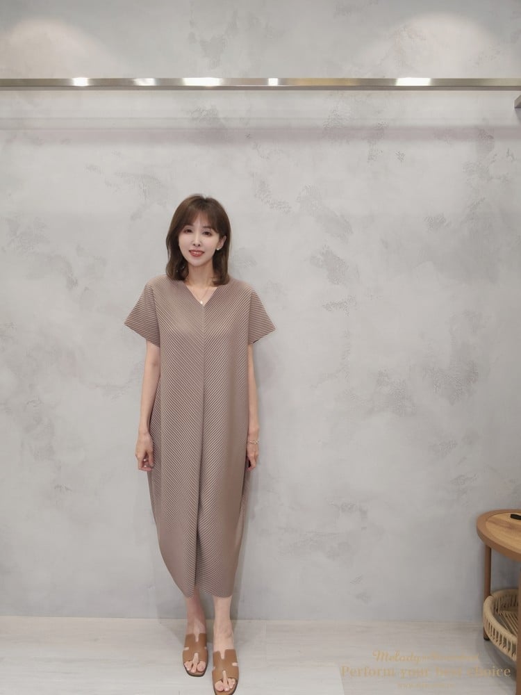 自訂款-V領坑條壓紋繭型洋裝(3色)